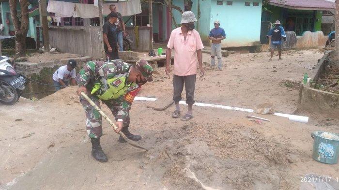 Babinsa Koramil 0907/03 Tarakan Barat, Sertu Safi'i bersama warga binaannya melakukan semenisasi jalan di RT 15 Kelurahan Karang Anyar, Kota Tarakan.