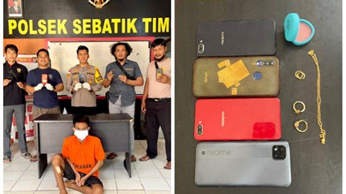 "Tersangka berhasil kami amankan di rumahnya. Dan barang bukti yang kami dapatkan berupa satu pasang anting emas, satu buah kalung emas, dua buah cincin emas, dua unit handphone yang telah dicuri oleh tersangka," ujarnya.